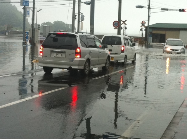 対策としてはあまりひどくない時は土のう袋を敷地外につんだり、水かきポンプで海に返したり。しかし写真くらいの冠水では意味がない。この状況が一ヶ月の間に何度もある。